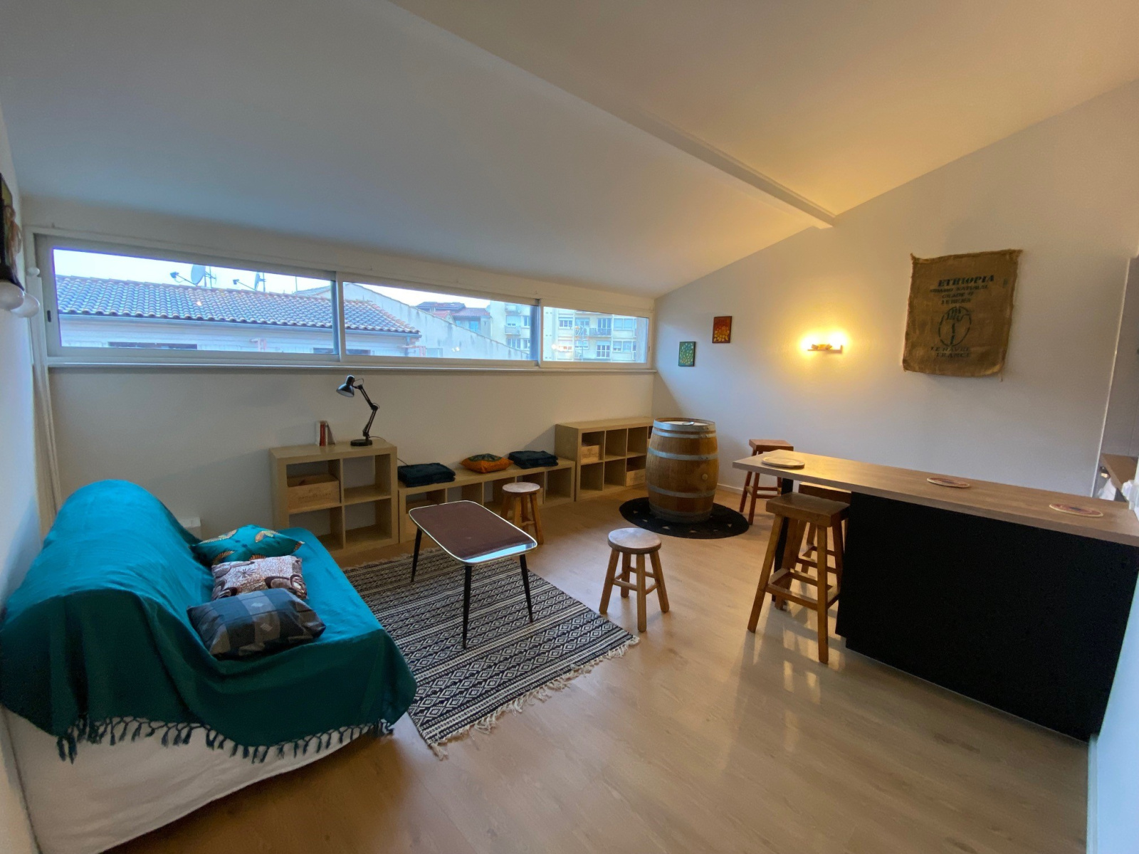 Il se compose d'une entrée, d'un séjour spacieux avec cuisine ouverte équipée (plaque vitrocéramique, frigo, hotte, machine à laver, canapé convertible). D'une grande chambre avec placard sur mesure et une salle d'eau attenante avec WC.