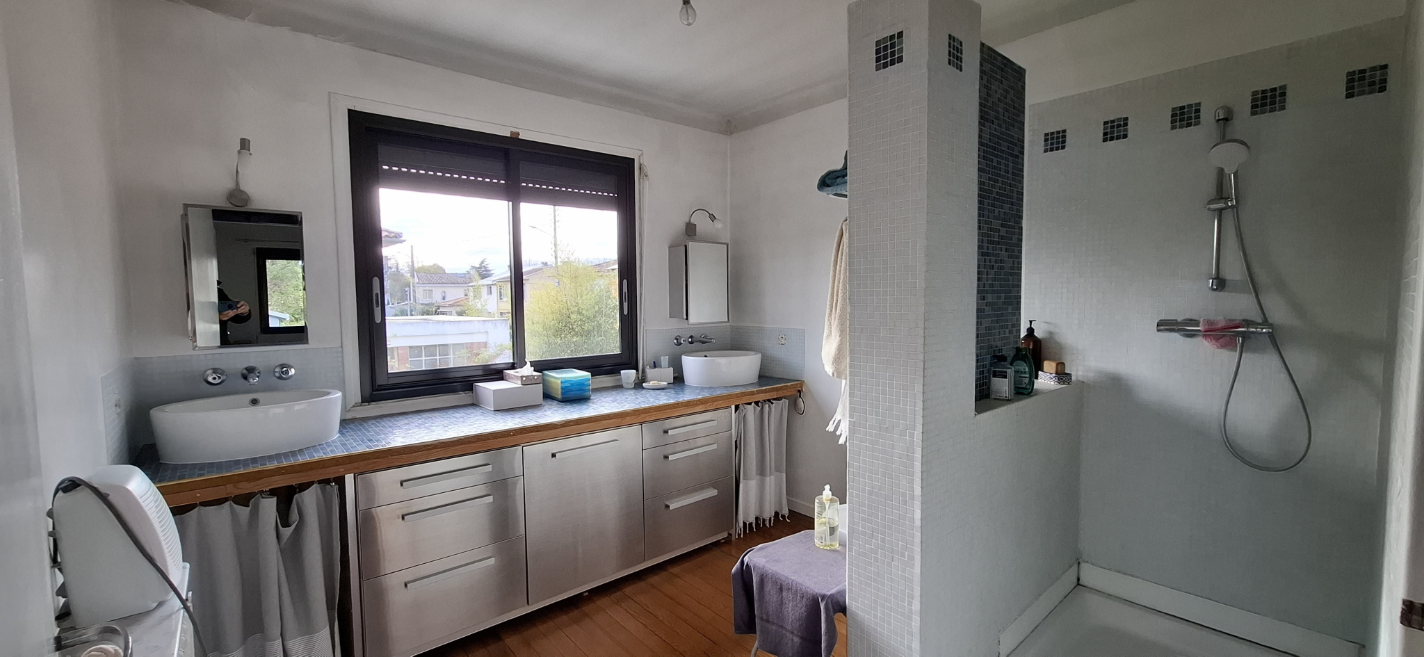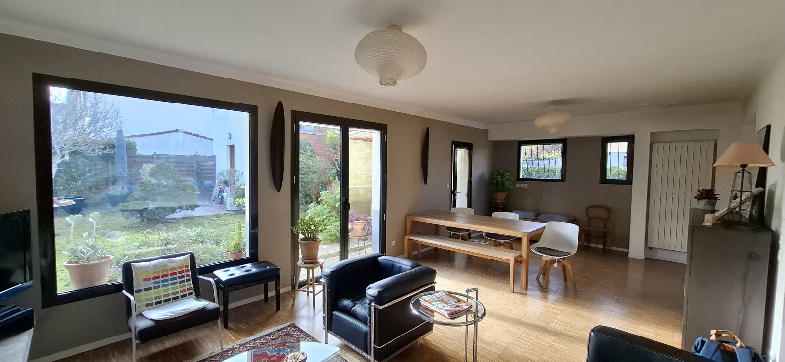 Elle se développe sur 2 niveaux, avec au rdc les pièces de vie. Hall d'entrée desservant, toilettes, une grande buanderie de 9m²; puis le très lumineux séjour et salle à manger de 32 m². Pour finir sur une cuisine récente et aux revêtements sobres et modernes. Deux plans de travail se faisant face. Cette pièce de vie familiale s'ouvre sur la parcelle arrière du jardin ; l'atout charme de ce bien. On y découvre de multiples petits espaces savamment ponctués d'arbres et arbustes entretenus. Il s'y dessine les cachettes des enfants comme les espaces de repas extérieurs avec sa terrasse en bois de 15-20 m². Un ancien local EDF bétonné sert aujourd'hui d'atelier sur plus de 12 m² et une belle hauteur sous-plafond. Il est à noter qu'il n'y a aucun vis à vis de fenêtres des parcelles voisines.